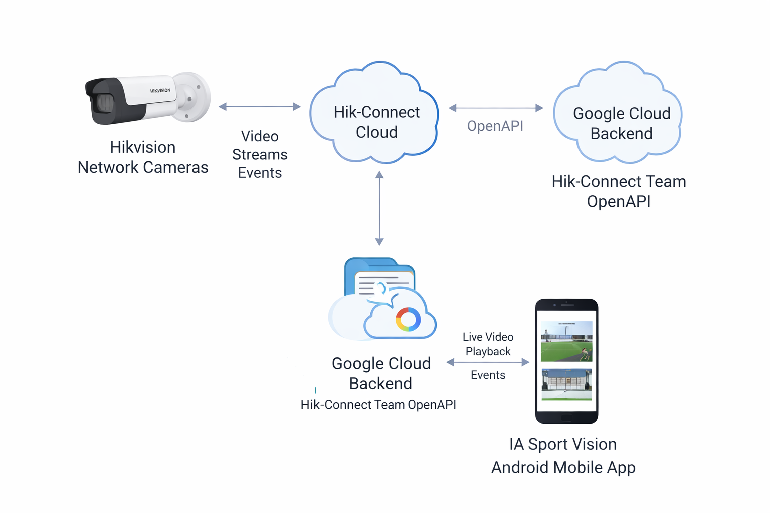 The solution integrates Hik-Connect Team OpenAPI with a Google Cloud back end and a custom Android application, enabling secure remote access to Hikvision network cameras without port forwarding or DDNS.